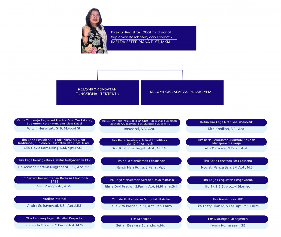 Direktorat Registrasi Obat Tradisional Suplemen Kesehatan dan Kosmetik merupakan salah satu dari 5 (lima) direktorat di Kedeputian Bidang Pengawasan Obat Tradisional, Suplemen Kesehatan, dan Kosmetik. Direktorat Registrasi Obat Tradisional Suplemen Kesehatan dan Kosmetik dalam menjalankan Visi dan Misi Badan POM melaksanakan pengawasan Pre-Market di bidang registrasi produk dan iklan obat tradisional, obat kuasi dan suplemen kesehatan, notifikasi kosmetika, evaluasi uji klinik dan uji praklinik obat tradisional, obat kuasi, suplemen kesehatan, dan kosmetika serta penilaian Dokumen Informasi Produk kosmetik