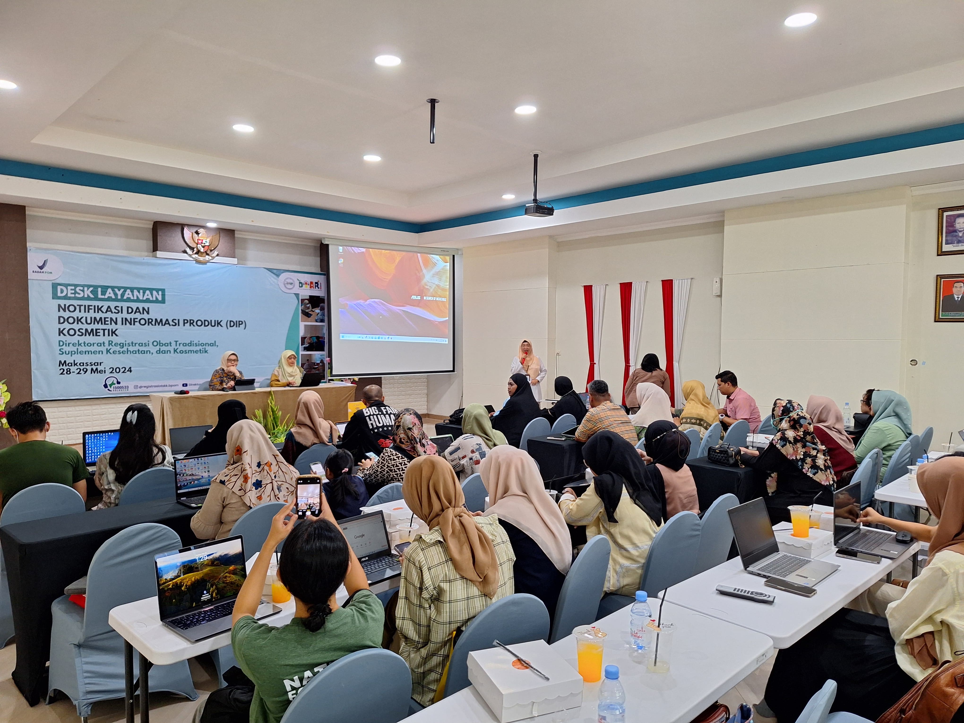 Dalam rangka meningkatkan pemahaman dan pengetahuan pelaku usaha kosmetik terkait regulasi, prosedur pengajuan Notifikasi Kosmetik, penyiapan Dokumen Informasi Produk (DIP) dan tindak lanjut hasil audit DIP, dilaksanakan kegiatan Desk Layanan Notifikasi dan DIP Kosmetik di Balai Besar POM di Makassar pada tanggal 28-29 Mei 2024. Kegiatan yang dilaksankan terdiri dari sosialisasi notifikasi kosmetik dan tata cara penyusunan DIP kosmetik serta desk layanan konsultasi.