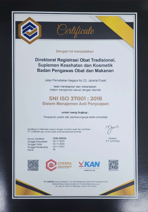 Direktorat Registrasi Obat Tradisional, Suplemen Kesehatan dan Kosmetik telah menerapkan sistem manajemen sesuai dengan standar SNI ISO 37001:2016 Sistem Manajemen Anti Penyuapan untuk ruang lingkup: Pelayanan publik dan pendukungnya serta konsultasi